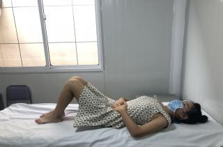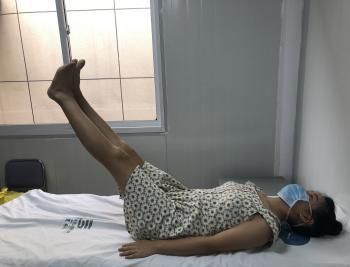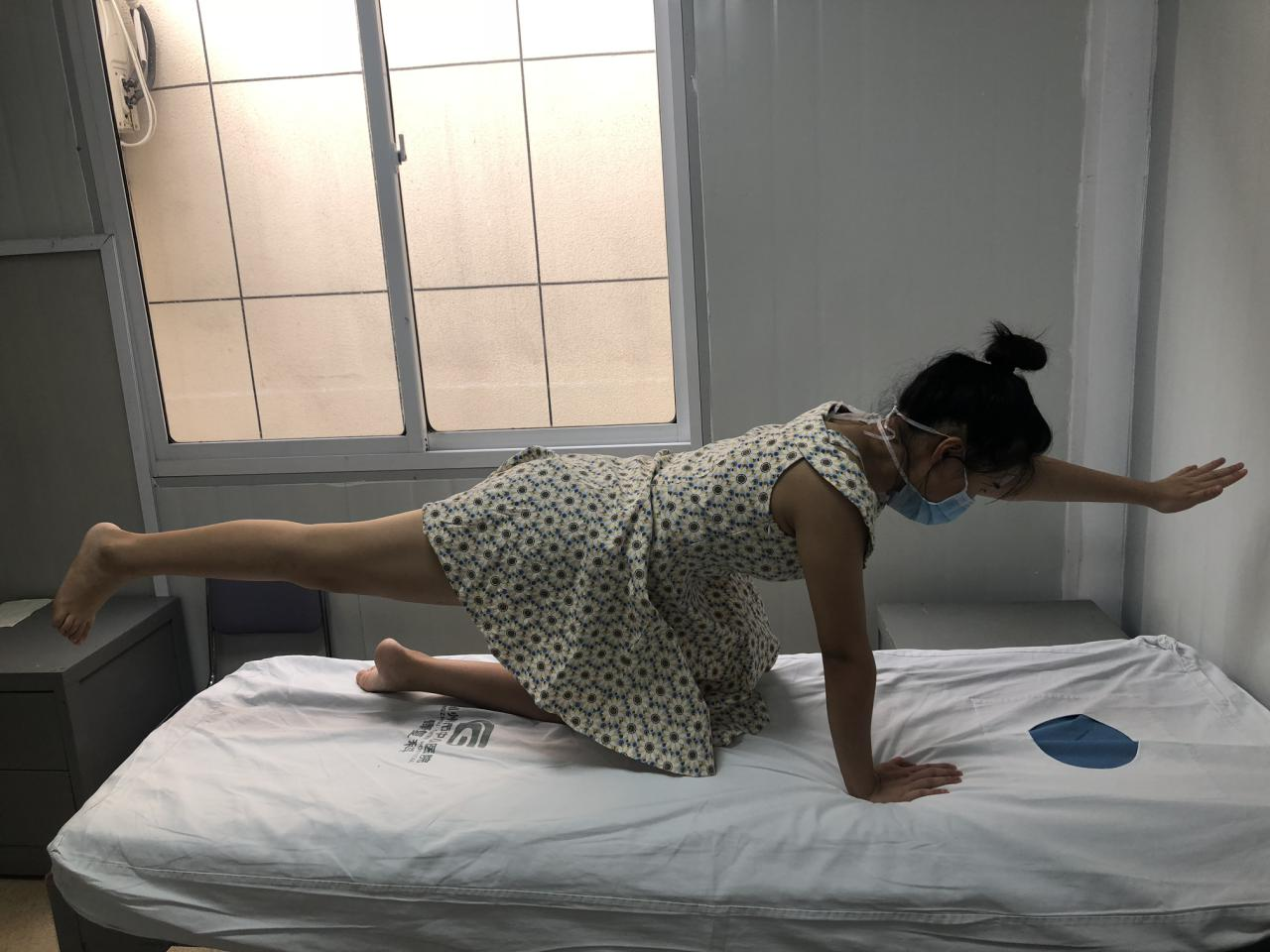 头部及肩部稍稍抬离床面,一只手触摸下腹部的中间位