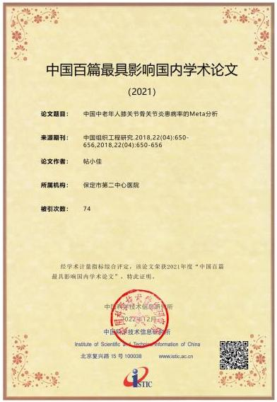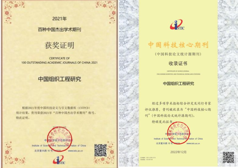 2022年12月29日,中国科学技术信息研究所在线公布《2022年中国科技论文统计报告》,《中国组织工程研究》杂志再次入选“中国百种杰出学术期刊”和“中国科技核心期刊”。