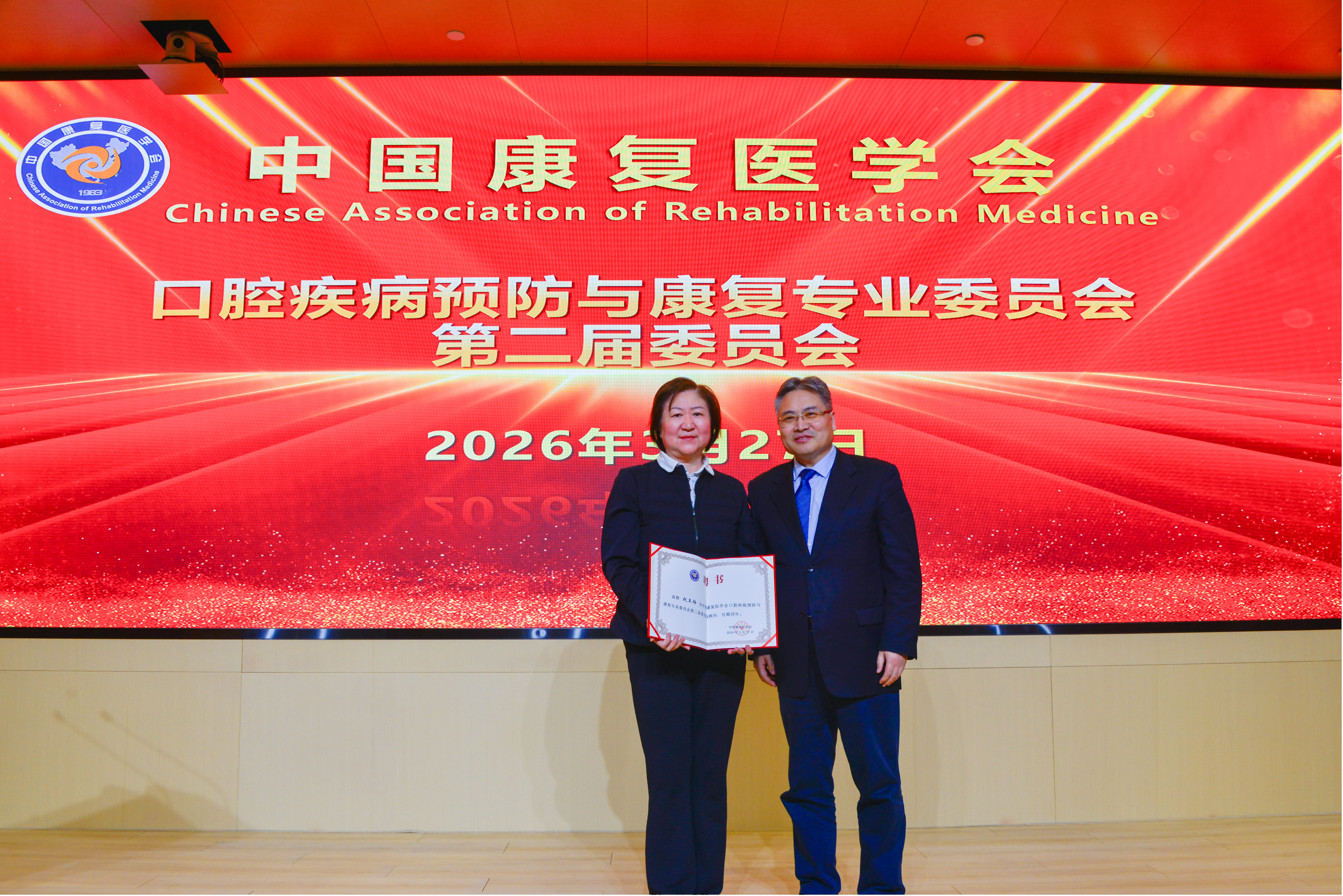 名誉主任委员唐国瑶教授和主任委员陈仁吉教授为中国康复医学会口腔疾病预防与康复专业委员会第二届委员会常务委员颁发聘书